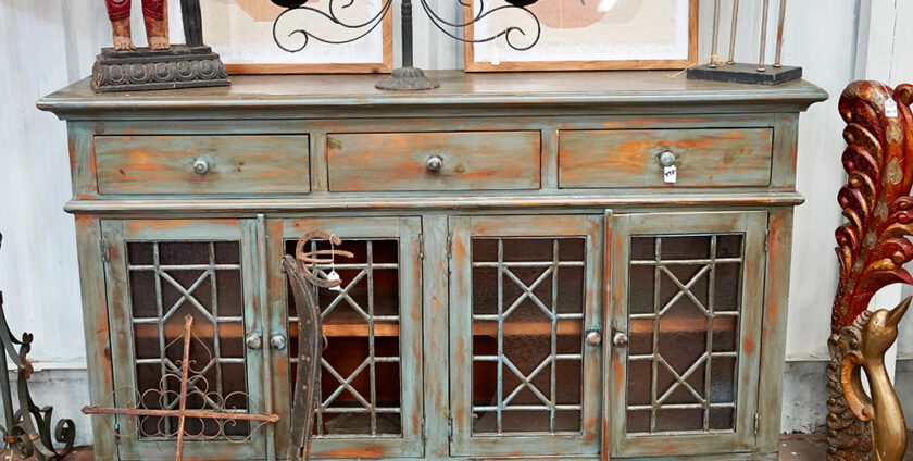 Distressed wood sideboard Style Distressed Blue Green Carved