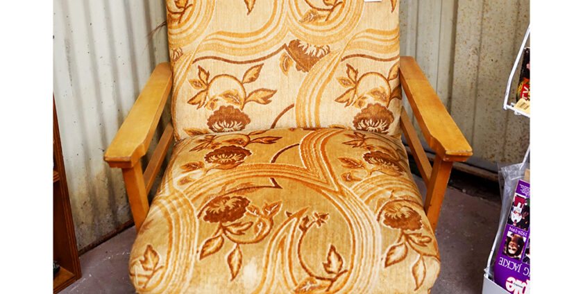 Mid-Century Modern style furniture piece featuring a wooden frame and a distinct floral or swirling fabric pattern