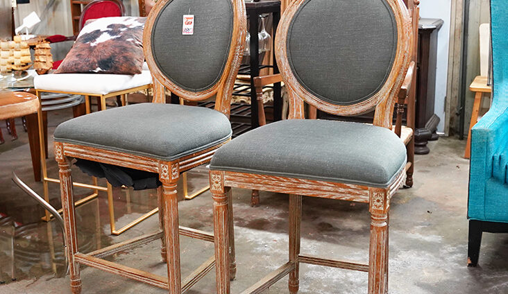 Vintage Louis XVI Style Carved Oak White Washed Counter Stools